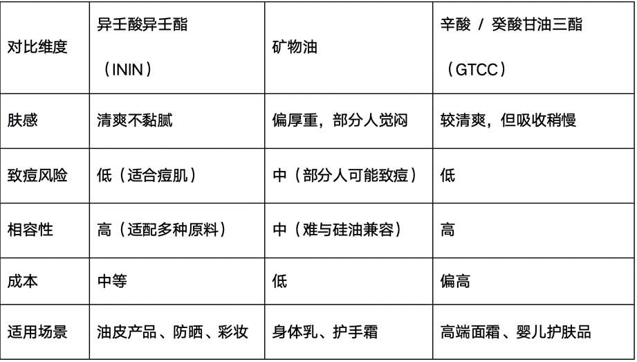 很多人会把异壬酸异壬酯和矿物油、辛酸 / 癸酸甘油三酯(JS GTCC)搞混,其实三者的定位差异很明显:
